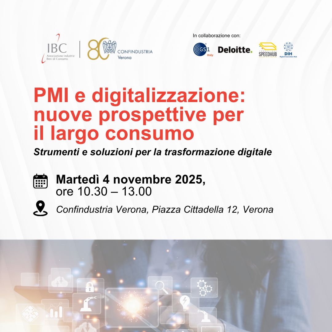 In collaborazione con Confindustria Verona e IBC, l'Associazione Industrie Beni di Consumo, abbiamo organizzato un incontro dal titolo "PMI e digitalizzazione: nuove prospettive per il largo consumo. Strumenti e soluzioni per la trasformazione digitale" per presentare le più recenti innovazioni e applicazioni dell’Intelligenza Artificiale pensate per le imprese del largo consumo. Durante l’evento verranno presentati nuovi casi d’uso e sviluppi concreti nell’ambito dell’IA, con l’obiettivo di offrire spunti pratici per accrescere la competitività e favorire la trasformazione digitale del settore. Ad affrontare il tema con noi anche i referenti delle aziende: Gruppo VéGé, Bauli e Panificio Zorzi che presenteranno esempi reali di innovazione applicata. L'evento si svolgerà il 4 novembre nella sede di Confindustria Verona, in Piazza Cittadella 12, Verona, dalle ore 10.30 alle ore 13.00. La partecipazione è libera e gratuita, previa registrazione online.