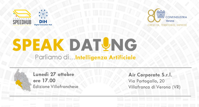 Il prossimo 27 ottobre, alle ore 17.00, si terrà “Speak Dating | Parliamo di… Intelligenza Artificiale”, un evento dedicato all'approfondimento dell'Intelligenza Artificiale e di come questa innovazione tecnologica possa essere integrata all'interno di processi aziendali, sistemi e modelli organizzativi.